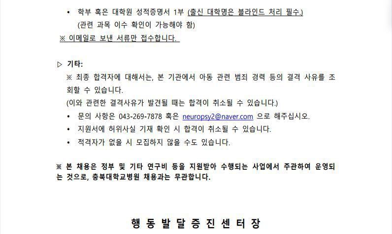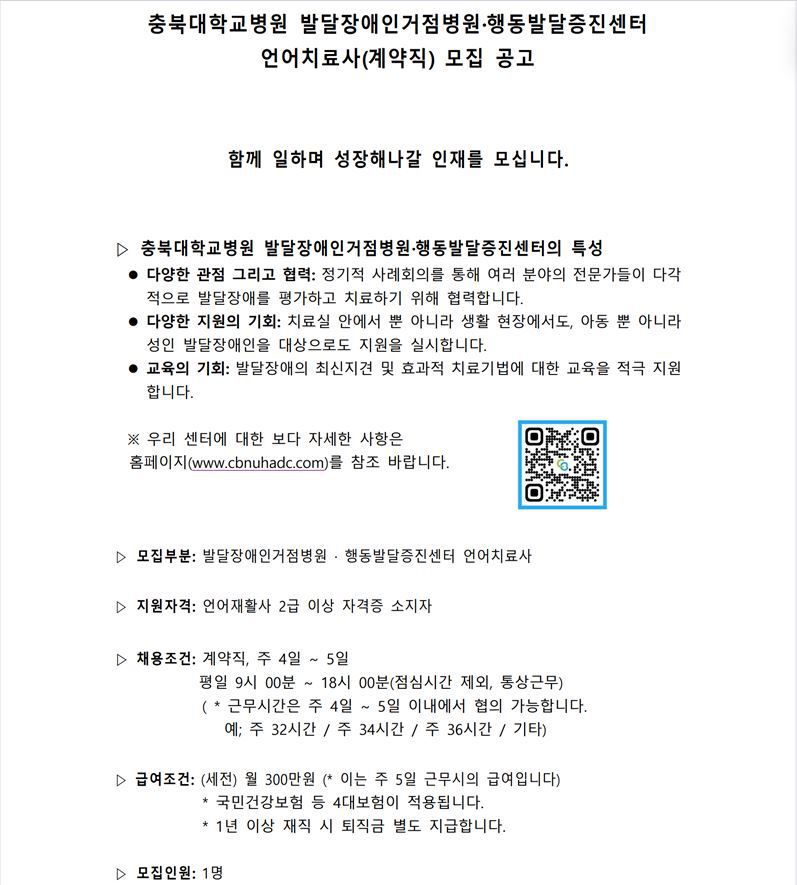 [충북대병원 행동발달증진센터] 언어치료사(언어재활사) 모집공고(블라인드 채용)