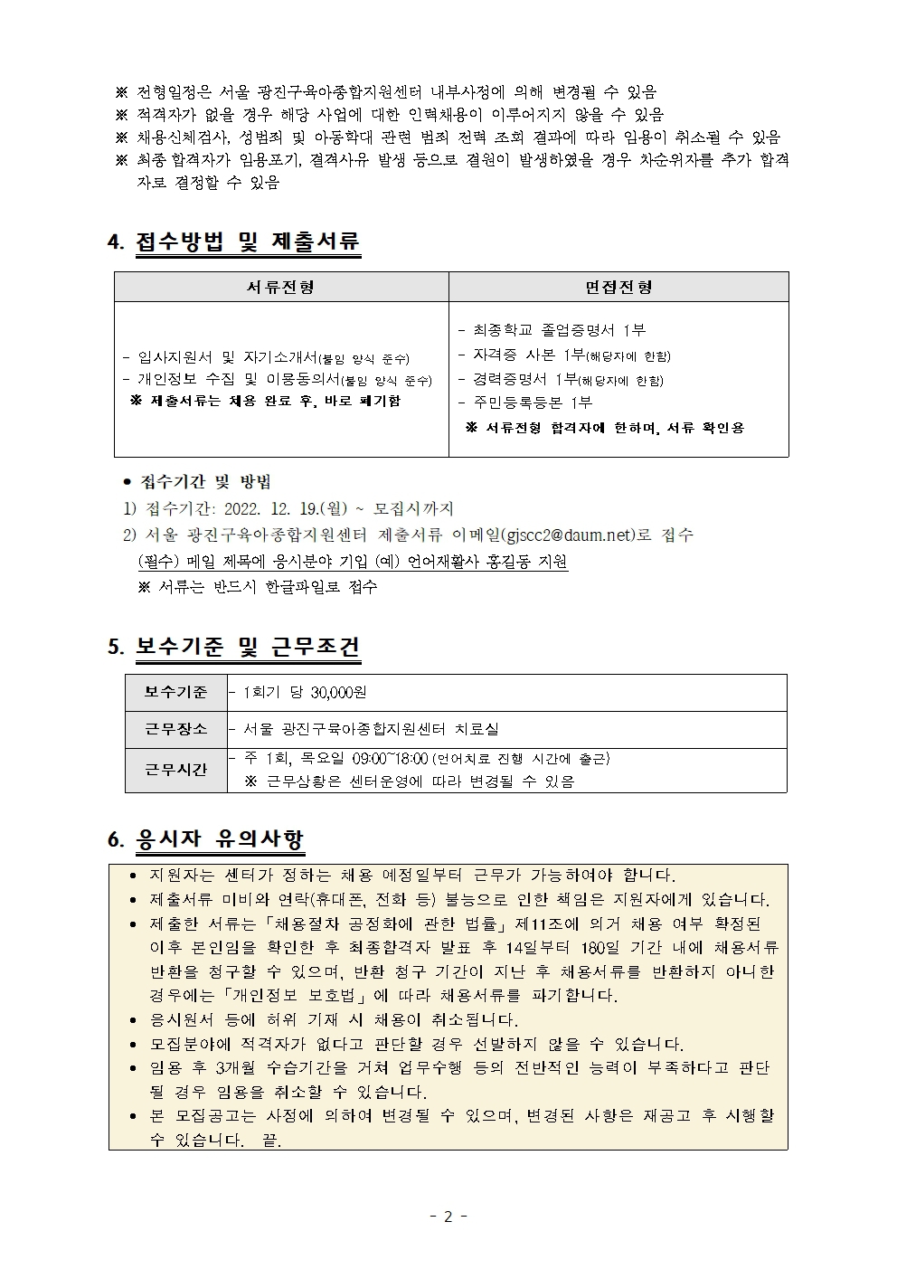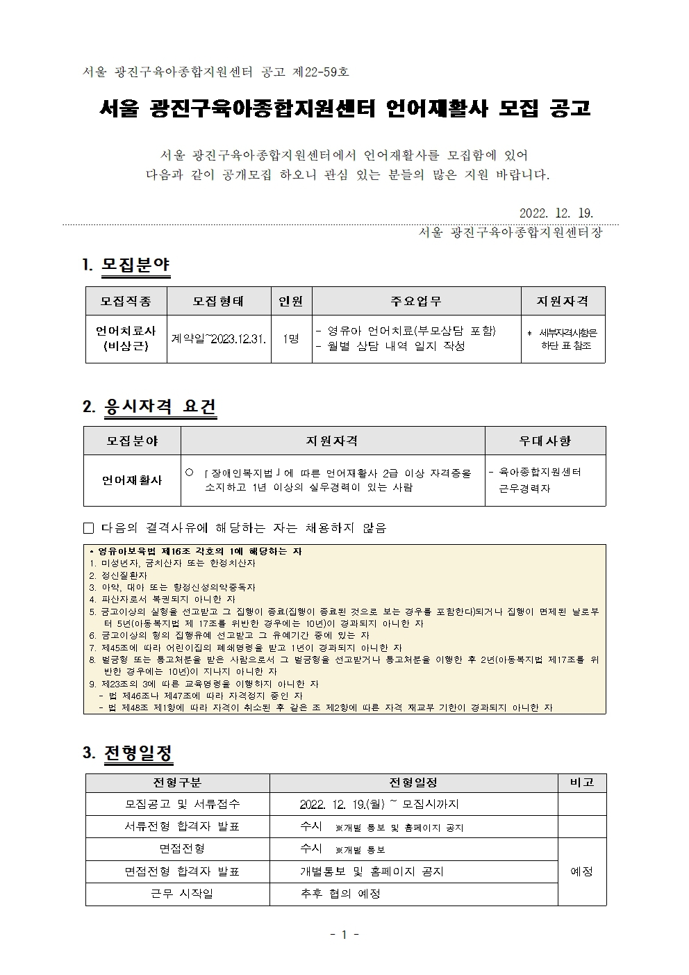 [서울 광진구육아종합지원센터] 언어재활사 모집 공고