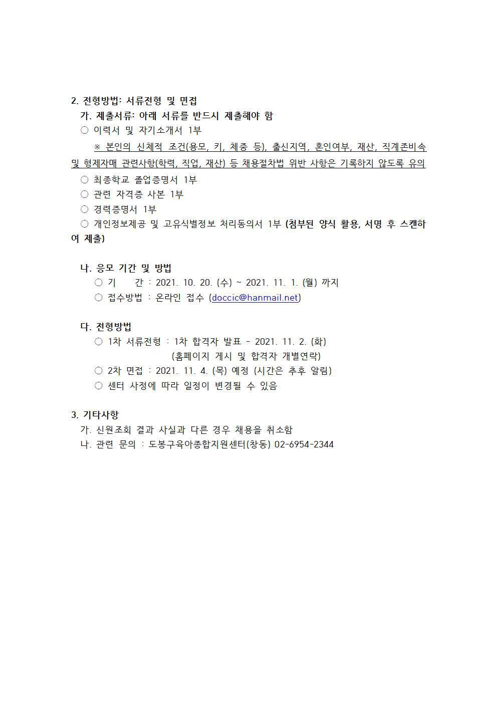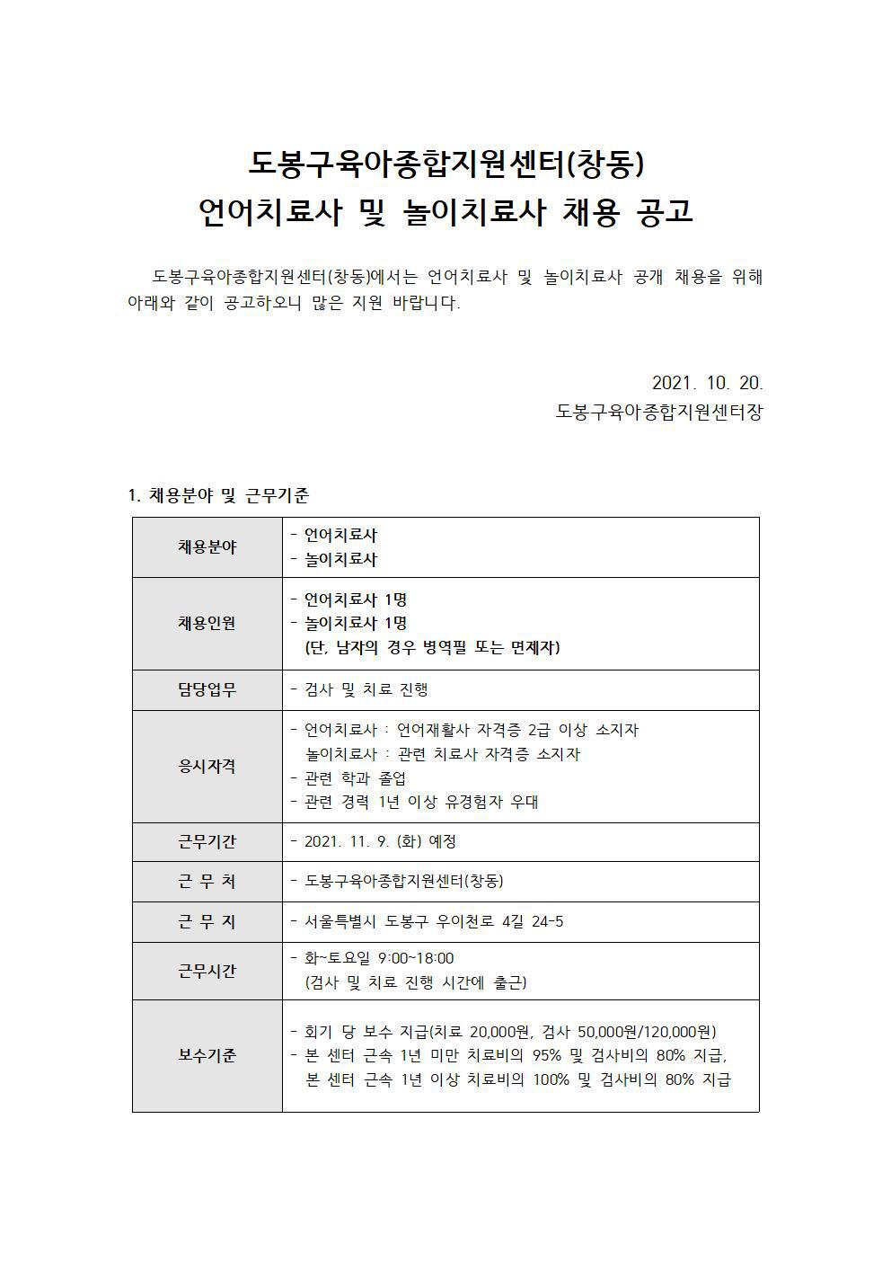 도봉구육아종합지원센터(창동) 언어치료사 및 놀이치료사 채용 공고