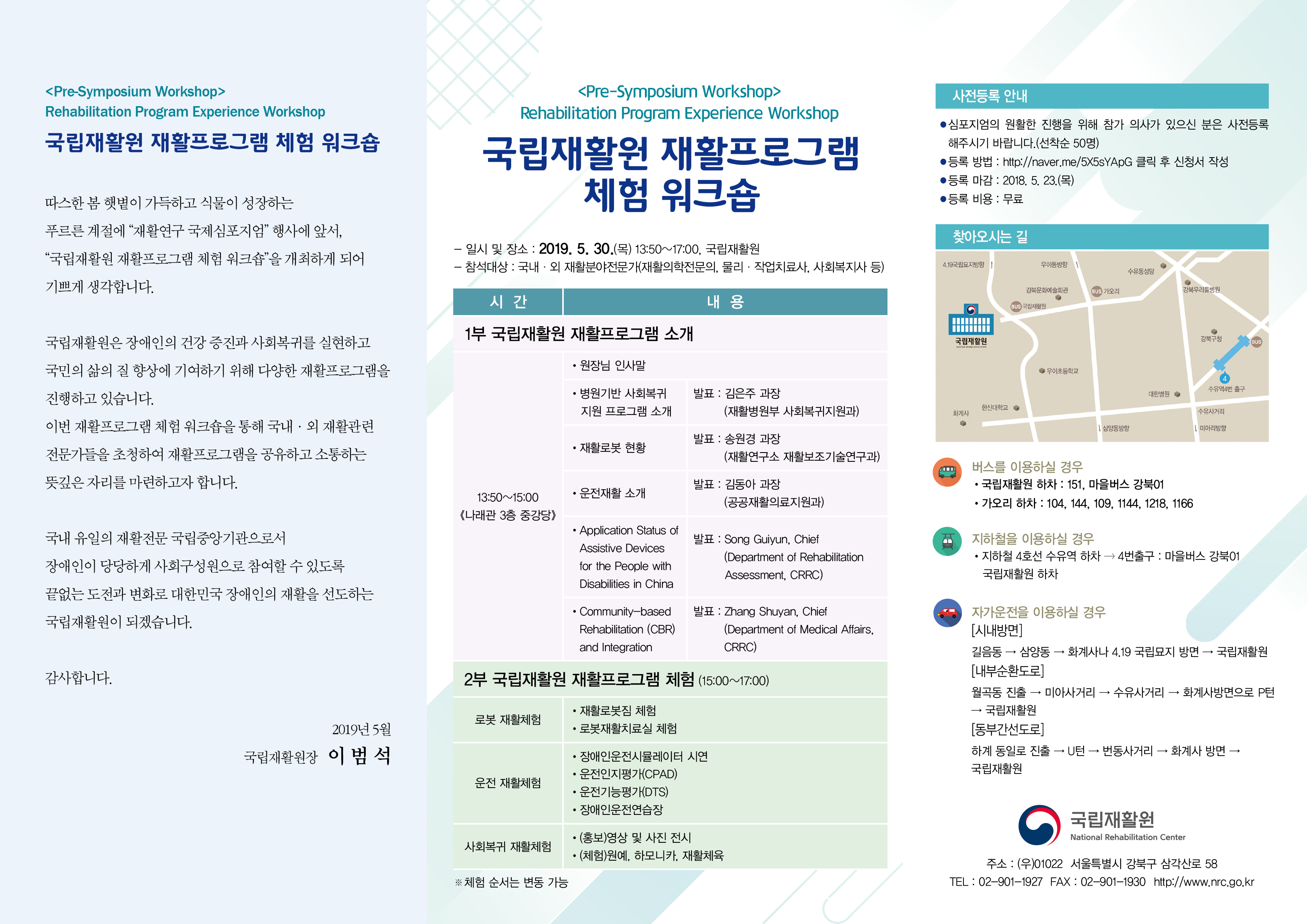 ○ Pre-Symposium Workshop 재활프로그램 체험 워크숍 : 장정아 연구원(02-901-1927)