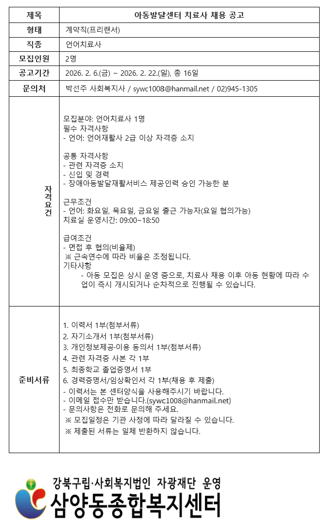 삼양동 종합복지센터 언어치료사 채용 공고