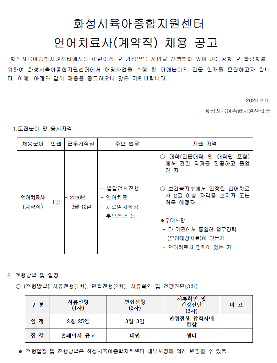 화성시육아종합지원센터 언어재활사 채용 공고